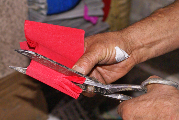 Doña Lolita told me about the different grades of paper used to create different styles of decoration on the piñata, and she explained different kinds of paper-cutting techniques; she's absolutely the expert.  Here, her son-in-law Fernando cuts tissue paper for fringe.  His hands are so fast with the scissors it made my head spin; he can even cut without looking.