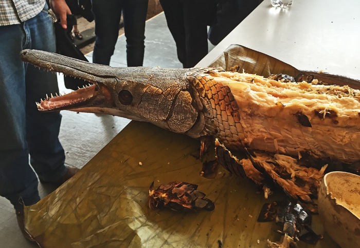 Morelia en Boca, an international food and wine festival, takes place in Morelia, Michoacán on the last weekend of each May, and we were there.  This fish is a pejelagarto, an enormous fish found primarily in the Mexican state of Tabasco.  Look at its needle-teeth!  The pejelagarto has no scales; its skin is like a suit of armor.  This section of the fish was about one-third of its length; it measured between three and four feet long.  World-acclaimed chef Aquiles Chávez brought this giant animal from Tabasco and cooked it (turning it with a broomstick rammed down its throat, all the way to the other end) over an open fire on the festival stage!  The demonstration conference also included Rosalba Morales Bartolo of San Jerónimo Purenchécuaro, Michoacán, who prepared her famously delicious charales (fish as tiny as the pejelagarto is huge) in the style her grandmother taught her.  This was without doubt the single best food conference I have ever attended; the skill, knowledge, and sense of humor on the part of both participants combined to receive a standing ovation at conference end.