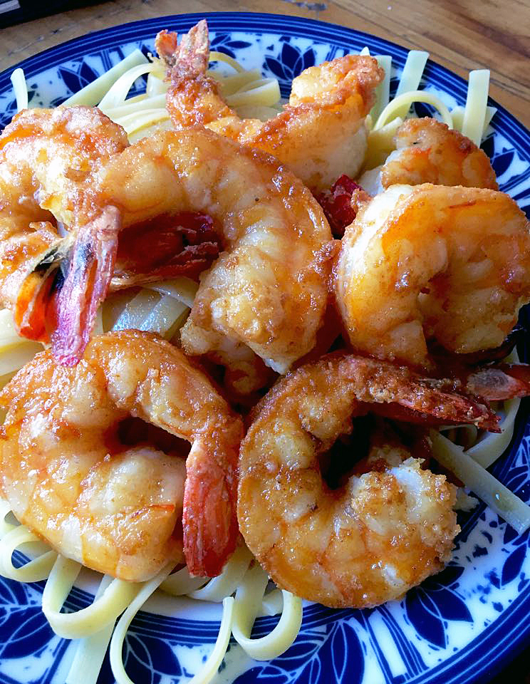 mber dish of beautiful shrimp muenìere, served over fettucine.