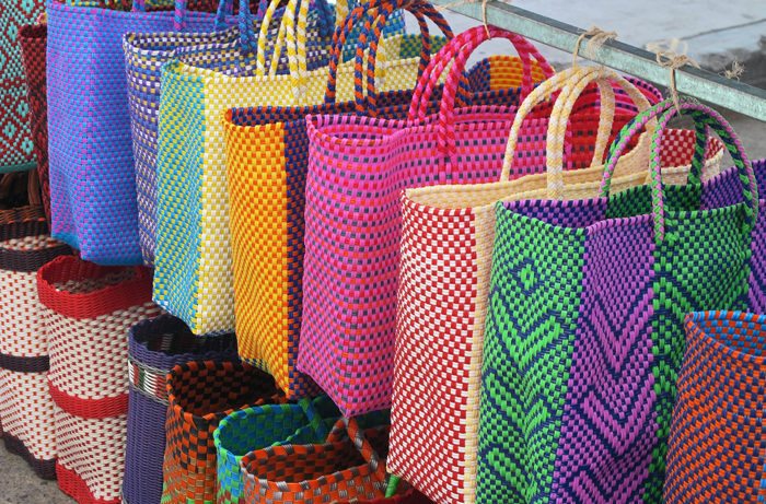 Pre-cut rounds of papel de china (tissue paper) wait to be glued onto a piñata.  The black plastic bag holds strips of newspaper.