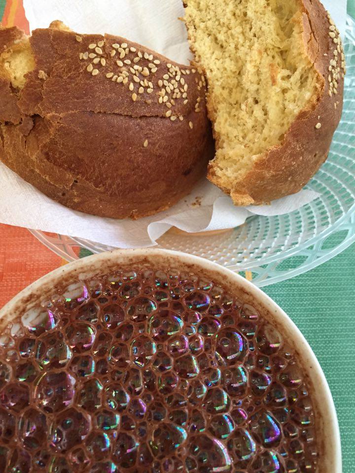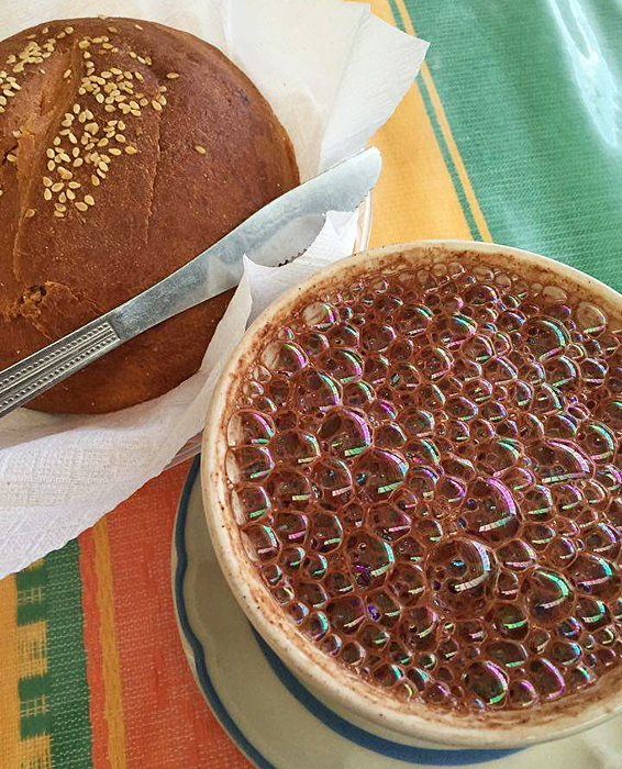 During a week-long tour to Oaxaca, our group breakfasted on typical pan de yema (egg yolk bread) and bubbly Oaxacan hot chocolate, made with water in the traditional way.