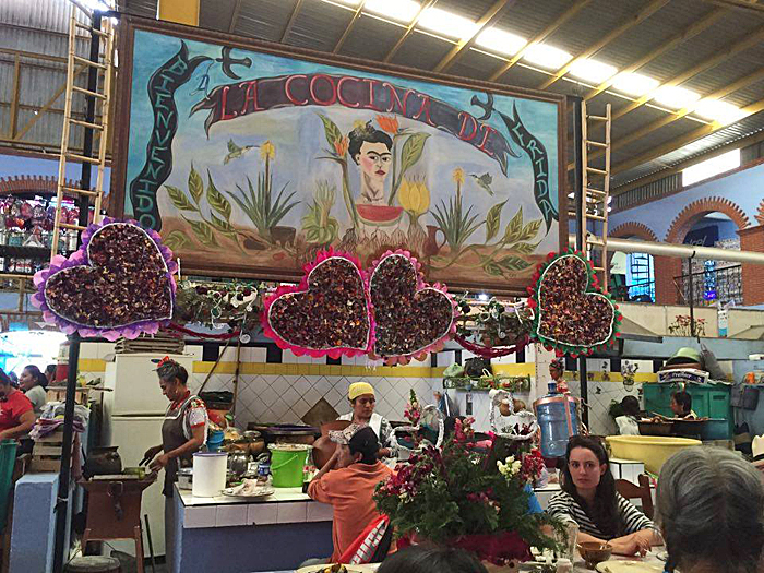 Our group had heard about the Ocotlán indoor market food stand called "La Cocina de Frida" (Frida's Kitchen). The owner's stock in trade is her strong resemblance to painter Frida Kahlo!  Click on the photo to enlarge it; you can see the owner, on the left, standing at the stove. We were intrigued and decided to eat there.