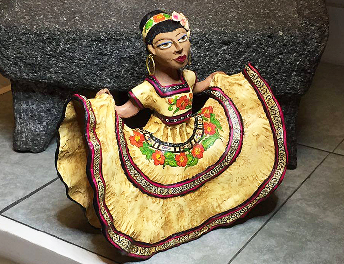 Juan Jesús García Águilar, doña Josefina's grandson, made this 6" high dancer with the fabulous sloe-eyes.  The brilliantly talented  young man is the fourth generation of potters in the Águilar family.  Please click on the photo to enlarge it for a better look at the detail.  Mexico Cooks! collection.