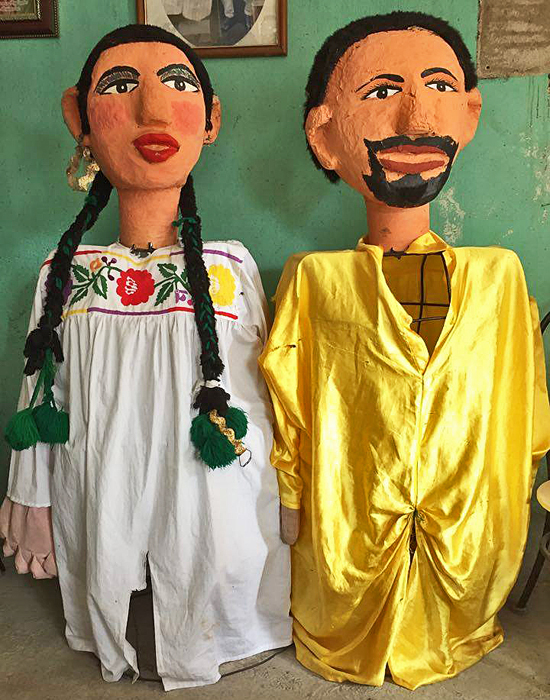 A pair of paper maché and bamboo mojigangas (giant dance puppets) created by doña Irene Águilar Alcantara. These are meant to be worn on the shoulders of adult dancers; they stand about fifteen feet high once attached to the dancer!  The soft, loose fabric arms twist around and around as the dancer gyrates.  Doña Irene also makes clay figures and other artistic work, but she creates these mojigangas by special request.