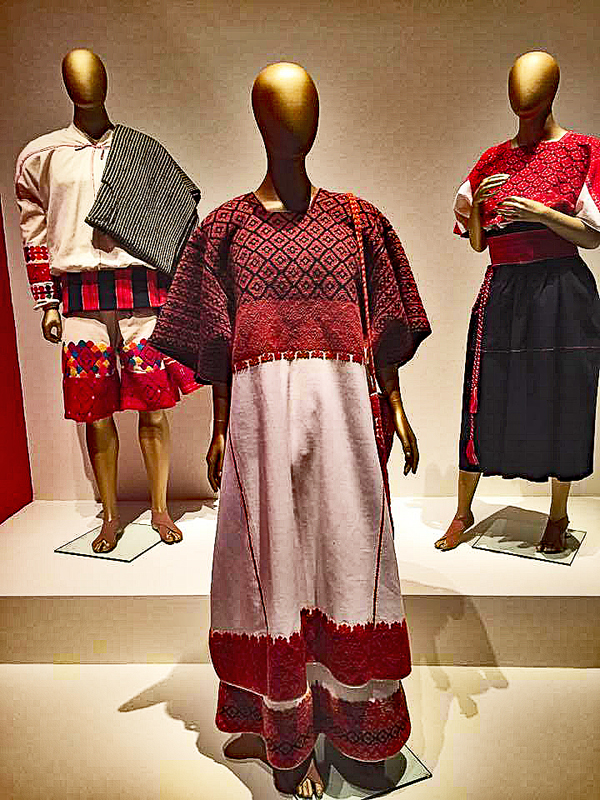 In May, Mexico Cooks! took the opportunity to take two groups of visitors to an exhibition titled Indumentaria y moda en México, 1940 – 2015, sponsored by Fomento Cultural Banamex, A.C. This stunning show of hand-made indigenous dress plus Mexican high fashion, accented by paintings of the period, was mounted by the extraordinary curator Ana Elena Mallet and her team. The pictured Tzotzil clothing from the mid-1930s, from a private collection, was hand spun, hand woven and hand sewn in Magdalenas, Chiapas.