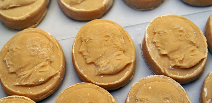 The candy maker created beautiful embossed jamoncillo (milk candy similar to penuche) ovals to honor Mexico's 2010 Bicentennial. Each one carries the image of a hero of Mexico's independence. These candies represent Miguel Hidalgo, father of the Independence. The candy molds are hand-carved by a museum employee.