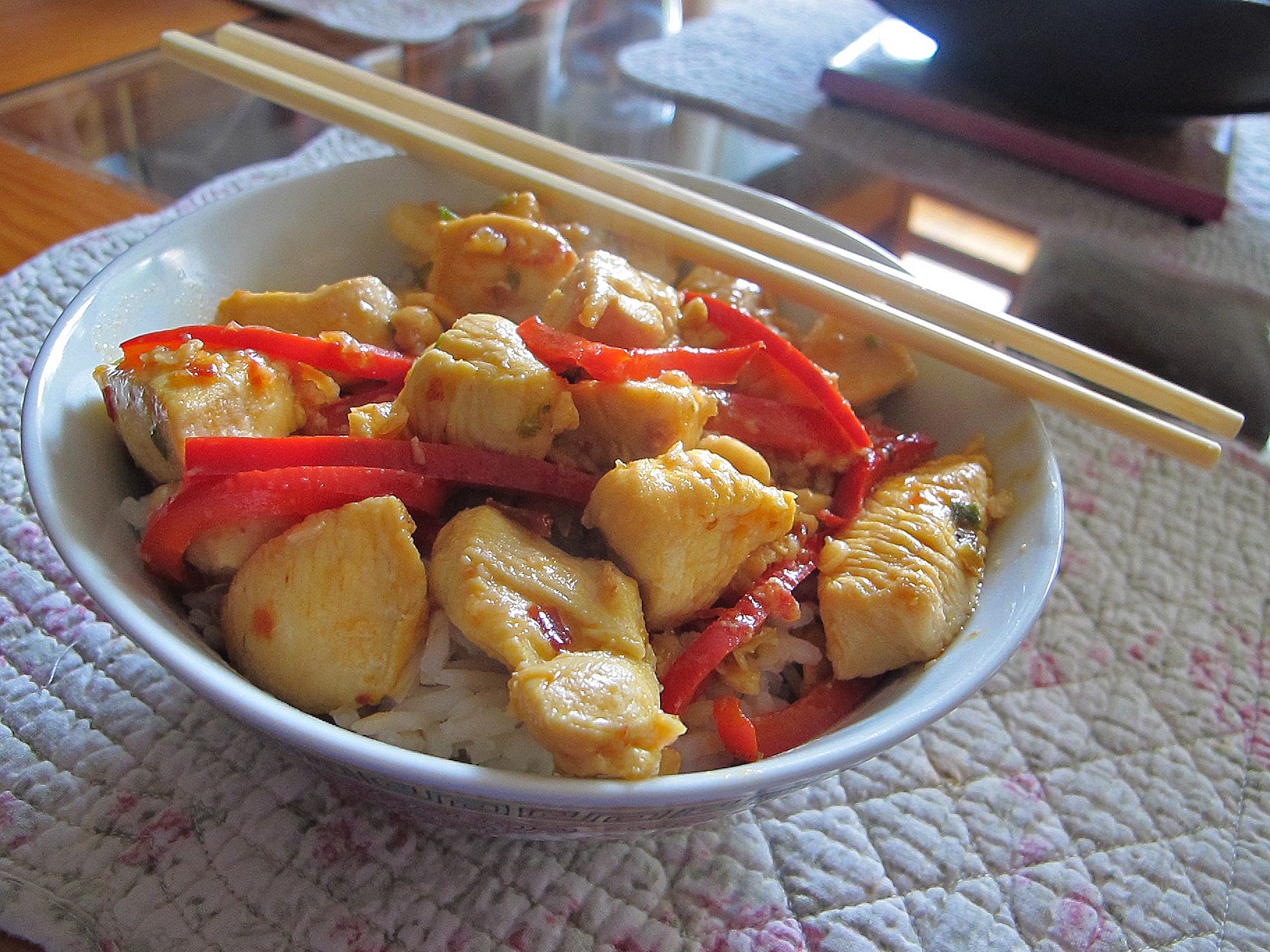 Arroz con mole de Xico (Mexican red rice with Xico-style mole), accompanied by a tiny serving of chicken breast and slices of plátanos machos fritos (fried ripe plantains). Xico, a lovely pueblo in Veracruz, is justifiably famous for its mole.