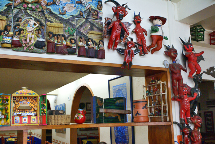 El Bajío's original restaurant is puro folclore (completely traditional and colorful) in its decor as well as in its extraordinarily delicious food. The cardboard Judas (devil figures) hanging on the wall are typically burned on Holy Saturday night, but these have survived to keep an eye on you as you dine.