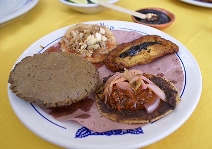 The first course brought to the table was a selection of several antojitos de banqueta (little sidewalk whims), so called because these treats are normally eaten while you're standing at a street stand. Clockwise from nine o'clock on the plate, we ate a gordita de frijol inflada (puffed-up thick tortilla, the masa mixed with black beans, served with that tiny dish of smoky salsa de chipotle meco), a garnacha Orizabeña (a small tortilla topped with Orizaba-style shredded beef, diced potato, and, in this case, red salsa), an empanada de plátano macho (the masa (dough) of the empanada is made of sweet, ripe plantain which is then filled with black beans and fried), and a panucho yucateco (a small tortilla covered with Yucatecan-style black beans, cochinita pibil, onion and chile habanero).