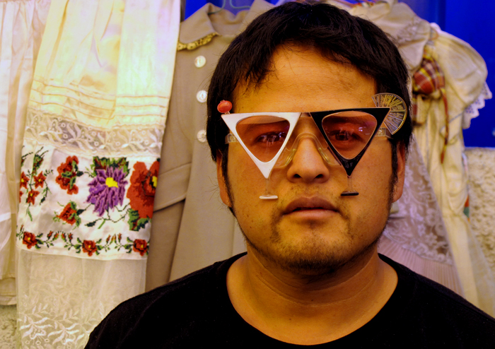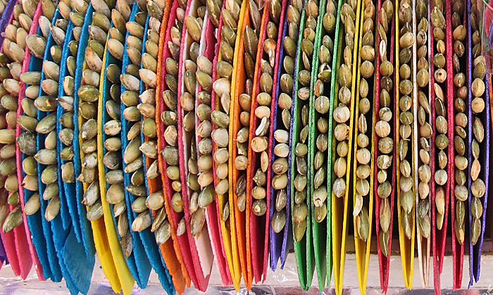 This wooden indigenous Huichol sculpture of a deer, a bit more than two feet long from head to tail, is completely covered first with beeswax and then with thousands of individually hand-placed tiny beads. This particular sculpture originated in and was brought to the fair by representatives of the state government of Nayarit. Click to enlarge any photo for a better view.