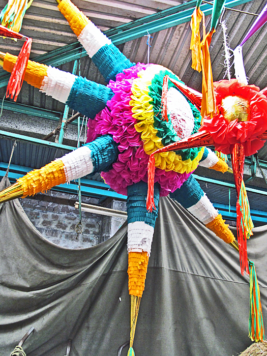 Blue papel picado (cut paper decoration) floating in the deep-blue Xochimilco sky wishes the Niñopan welcome and wishes all of us Feliz Navidad.