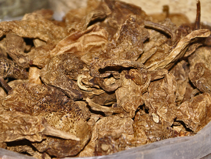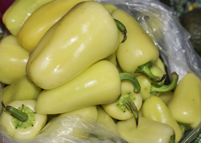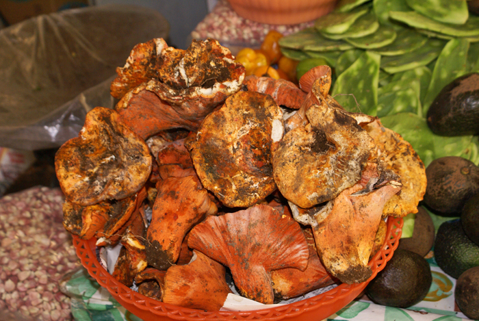 The vendor at this small booth at the Pátzcuaro market had an interesting variety of things for sale. Bottom right are fresh guavas, just now coming into season. To the left of the guavas are chiles perón (aka chiles manzano), arguably the most-used chile in this part of Michoacán. Above the chiles perón are fresh, green chiles de árbol. To the right are wild mushrooms known as patita de pájaro (little bird foot). These mushrooms, growing wild in Michoacán's woods and foraged during the rainy season, make a wonderful mushroom soup.