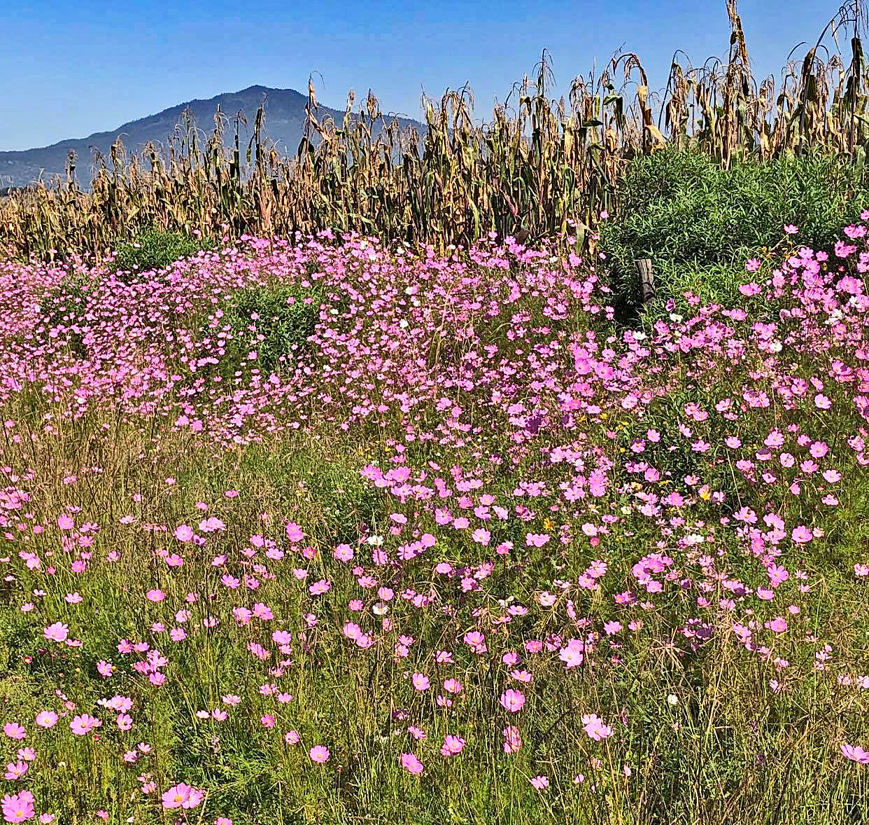 The area around Lake Pátzcuaro, in the state of Michoacán, bursts into wildflower bloom in late September, just as the rainy season is ending here. The flowers are naturalized wild cosmos, known here as mirasoles ("look-at-the-sun"). Entire fields fill with swaths of these delicate flowers, turning our green countryside into a temporary sea of pink. Behind the mirasoles is a milpa, a field of native Michoacán corn, beans, and squash.
