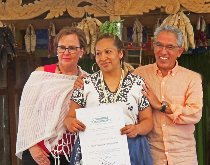 Sra. María Eugenia Zaragoza holds a jar of preserved membrillos.