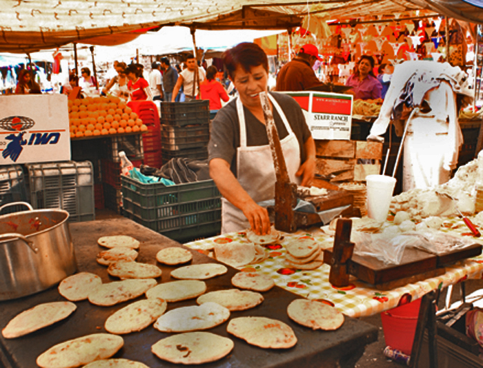 Back outside, Sra. Zaragoza showed me the neatly shelved bottles of ponche. "It's all natural. It only contains fruit, sugar, water, and alcohol. We make it and bottle it at home. It costs $30 pesos for a liter. And here is the conserva. The jars, ??about a kilo each, ??sell for $40 pesos." The color of the preserved fruits in syrup was beautifully dark red. "And of course we also make empanadas (a sweet Mexican turnover) filled with ate." She pointed to the plastic-wrapped packages on the shelves. "They're delicious for breakfast or dessert."