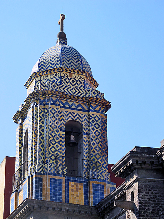 The ornately tiled dome of the Templo de Nuestra Señora de la Valvanera.  All of these talavera tiles were made in Puebla.  This beautiful church is also known as the Cathedal of the Maronite Eparchy of Our Lady of the Martyrs of Lebanon.  It is one of only two churches in Mexico City that are decorated with Puebla's talavera tile. The church, built in the 17th century and dedicated in 1671, is open daily for all who care to spend a few minutes away from the bustle of the street.