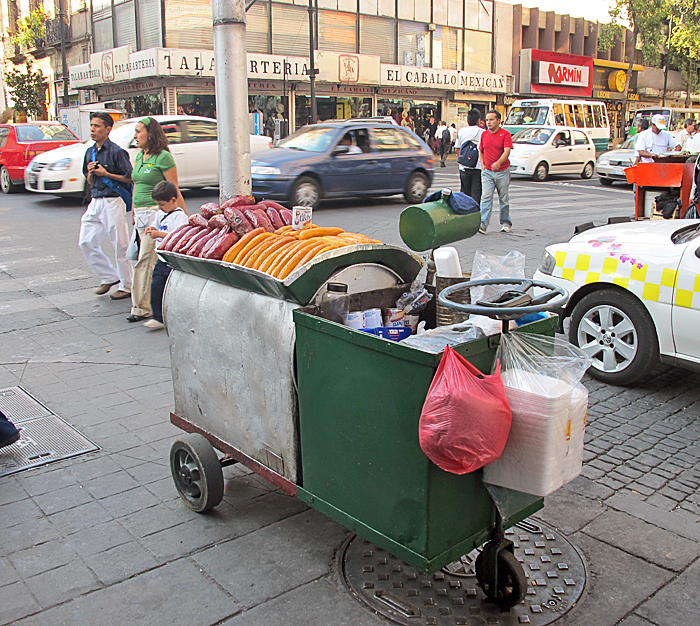 Detail, camotes y plátanos–with the ubiquitous can of La Lechera (sweetened condensed milk) that is poured generously over your purchase of either a delicious newly baked sweet potato or a freshly baked banana.  Little by little, these wonderfully fragrant carts are disappearing from Mexico City's streets.  As I chatted with the camotero, I mentioned that quite late many nights–as late as one o'clock in the morning–I've heard a vendor passing by on a far-flung street and blowing his whistle.  The camotero on Calle República de Uruguay scoffed and said that the vendor in that neighborhood was probably selling something other than camotes.  "Quién va a querer un camote a estas horas?"  (Who would want a sweet potato at that hour!)
