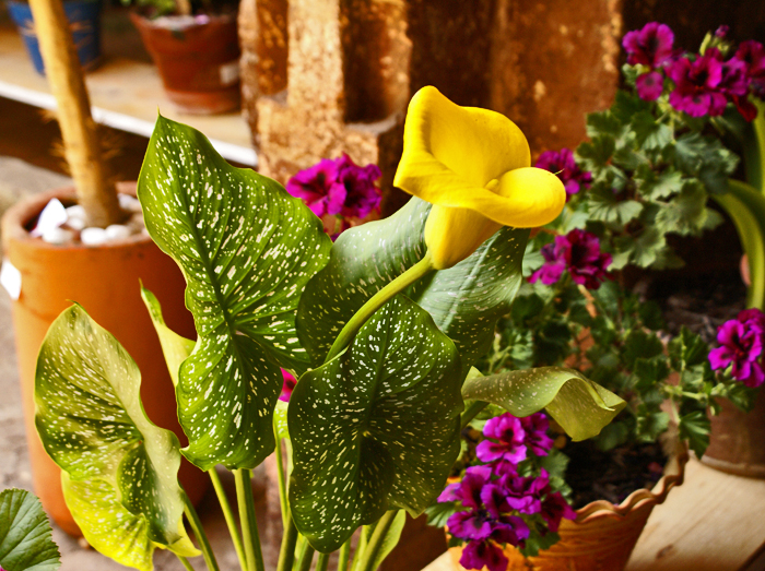 In Erongarícuaro, a golden calla lily and a pot of deep purple Martha Washington geraniums made us smile.