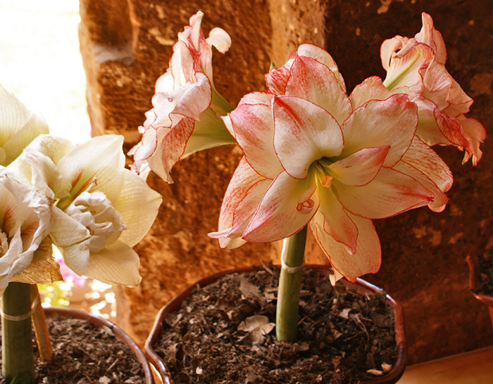 More amaryllis, this variety sported huge cream and pink blossoms.
