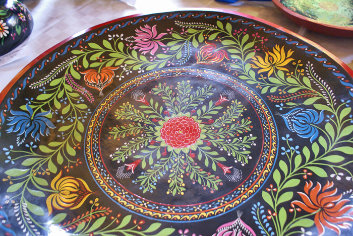 Hand-lacquered wooden bateas (shallow trays) are a specialty of the Pátzcuaro/Uruapan region.  The maque (lacquer) technique is intricate and time-consuming; the tray is carved from pine, cured, and then decorated using centuries-old craftsmanship and dyemaking knowledge.  This batea measures approximately 50cm in diameter (1.5 feet).