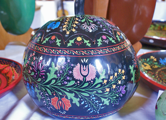 A guaje (hard-shell squash), hollowed out, cured, and decorated with hand-prepared maque (lacquer).  The artisan applies the base color lacquer and allows it to cure.  After preparing vegetable dye lacquers, the artist incises a design into the dry base lacquer and removes the individual color sections, leaf by leaf and stem by stem, petal by petal.  The artist inlays all of one lacquer color and allows it to cure.  He or she then removes the design elements of the next color and repeats the inlay process.  Finishing a guaje as detailed as this one requires many weeks of work.