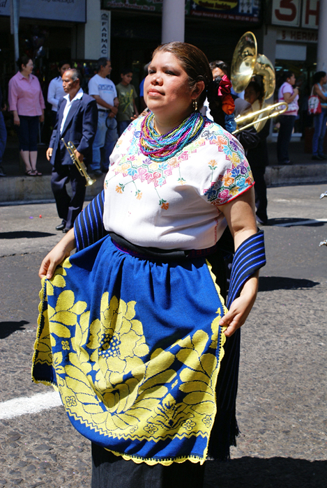 This woman marched while carrying an enormous huarache (shoe made of woven leather strips) representing the goods that her region of the state produces.  She's also carrying a bag of souvenir key chains that she tossed to individuals in the crowd.  Look closely and you'll see the tiny huarache key chains that decorate her sombrero de paja (straw hat).