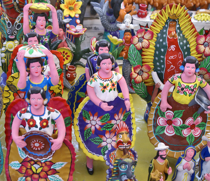 Clay sculptures from Ocumicho, Michoacán, are full of whimsy and bright colors.  Did you notice Our Lady of Guadalupe, in the upper right corner?
