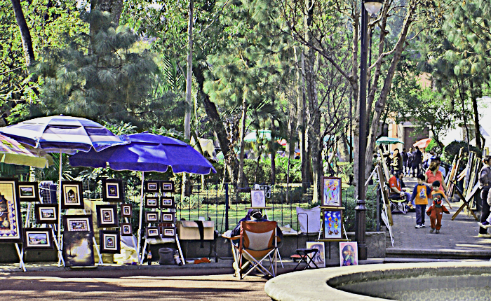 In the Atrio de los Olivos, crowds picnic, dance, and buy or sell artesanías (arts and crafts) and regional foods in the shade of ancient olive and cypress trees.