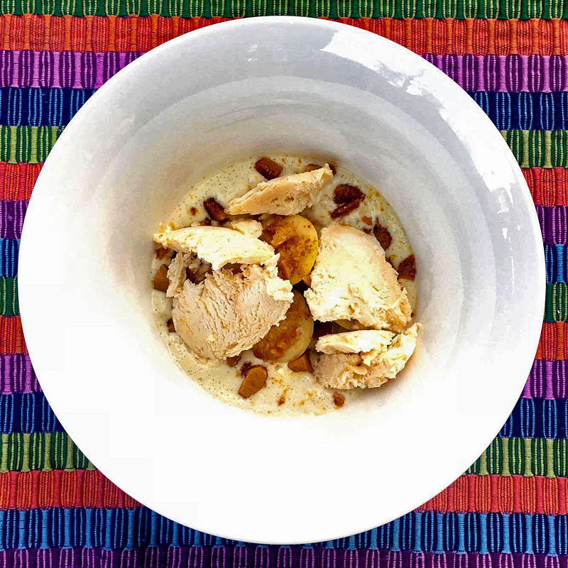 One of the several desserts on the menu when Mexico Cooks! was at TrasLomita: arroz con leche (Mexican rice pudding) with tweaks by Sheyla Alvarado, the incredibly talented young chef.  The base is traditional arroz con leche, which is served with conserve of fresh guavas, honey, nuts, and house-made ice cream.  Photo courtesy Fernando Gaxiola of Baja Wine + Food.