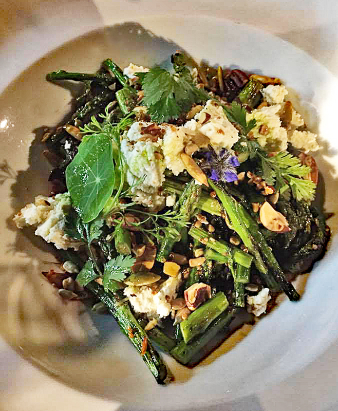 To finish our two-day February tour in Valle de Guadalupe, we ate our farewell dinner at the impeccable TrasLomita Comedor Campestre. The beautiful setting outdoors under the trees, the wonderful owners and staff, and the really marvelous meal made our evening perfect. Above, a salad of grilled asparagus, seasonal greens, a variety of seeds, and ricotta cheese–all dressed with epazote oil.  Two of us split the salad, but either of us could have eaten the whole thing!