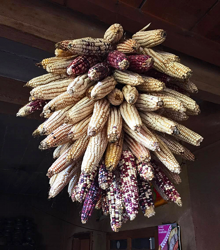 In late February, Mexico Cooks! took a tour group to Morelia and neighboring towns in Michoacán.  One of our stops was in Santa Fe de la Laguna, at the taller (workshop) of grand master potter Nicolás Fabián Fermín and his wife, María del Rosario Lucas, a potter in her own right and one of Michoacán's well-known cocineras tradicionales (traditional home cooks).  This large bunch of mazorcas (ears of native corns) was drying, hanging from the ceiling beams.