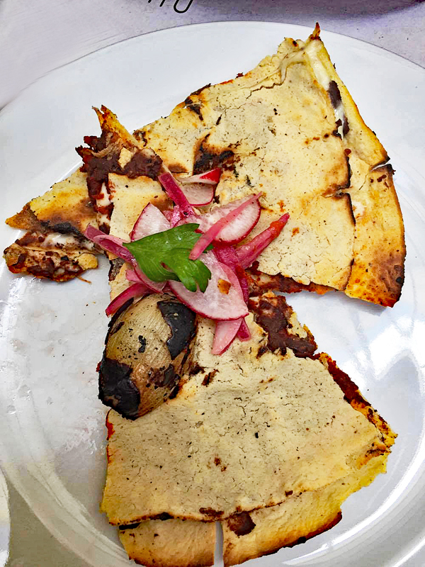 Ceremonial tortillas from the state of Guanajuato, made only in the Otomí communities of that state as food for certain ritual occasions. These were served at Restaurante Azul Condesa during July 2016, when Guanajuato's cuisine was featured for the month at the restaurant. They became so deservedly popular that the restaurant has continued to offer them.  The tortillas, made of nixtamalized corn masa (dough), are shaped, pressed, and cooked on one side on a comal (griddle). They are then flipped and stamped with a hand-carved wooden stamp that has been dipped in muicle, a liquid vegetable dye made from a wild plant.