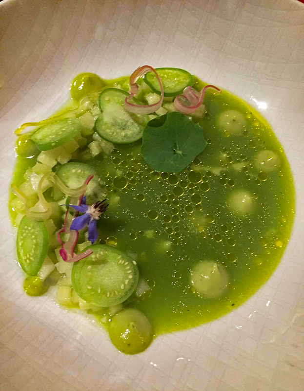 On the spring menu at Restaurante Pehua (the name means 'beginnings' in Náhuatl), an appetizer called 'Monocromatismo' (monochromatic). The dish is composed of finely minced green chayote and green apple, a light agua (in this case, a cool broth) of tomatillos, and swiss chard. Neither my supper comp
