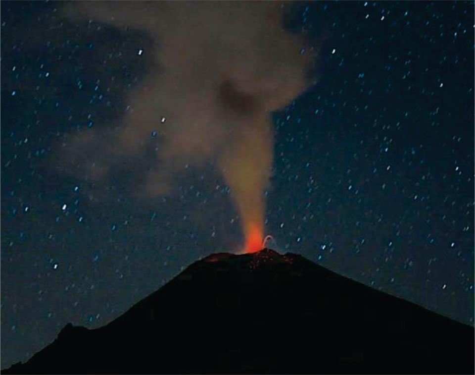 Life imitates art.  April 16, 2012 photo of volcano Popocatépetl spewing flame, ash, and smoke.  Popocatépetl straddles the state line between Puebla and Morelos, approximately 40 miles south of Mexico City.  Photo courtesy Todo Oaxaca.