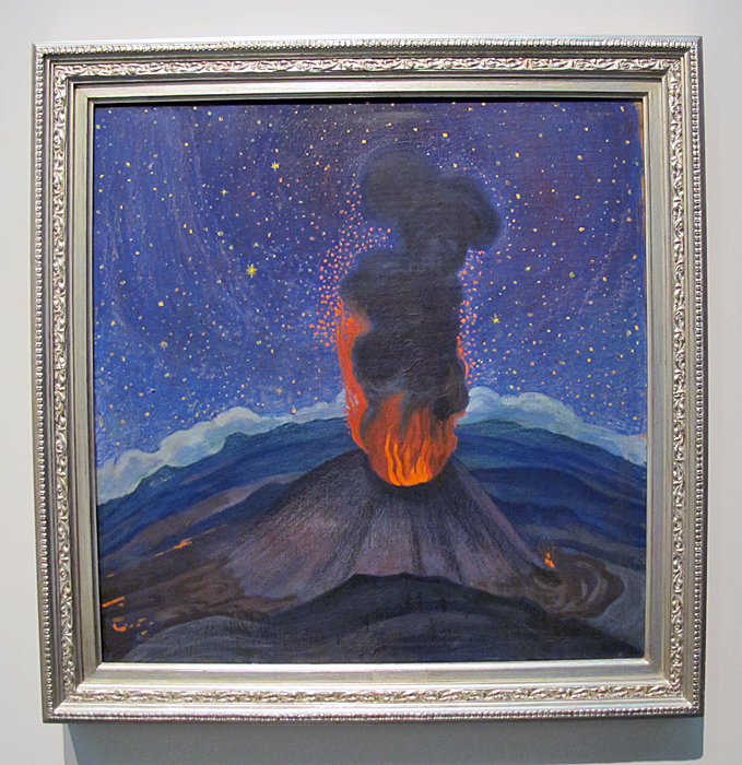 Volcán en la Noche Estrellada (Volcano on a Starry Night), 1950 (Paricutín).  Atl color on plywood.  Collection UNAM.  Dr. Atl was the first artist to paint what he called 'aeropaisajes' (landscapes from the air); he took to the skies in small airplanes, flying over various volcano sites to immortalize them from above.