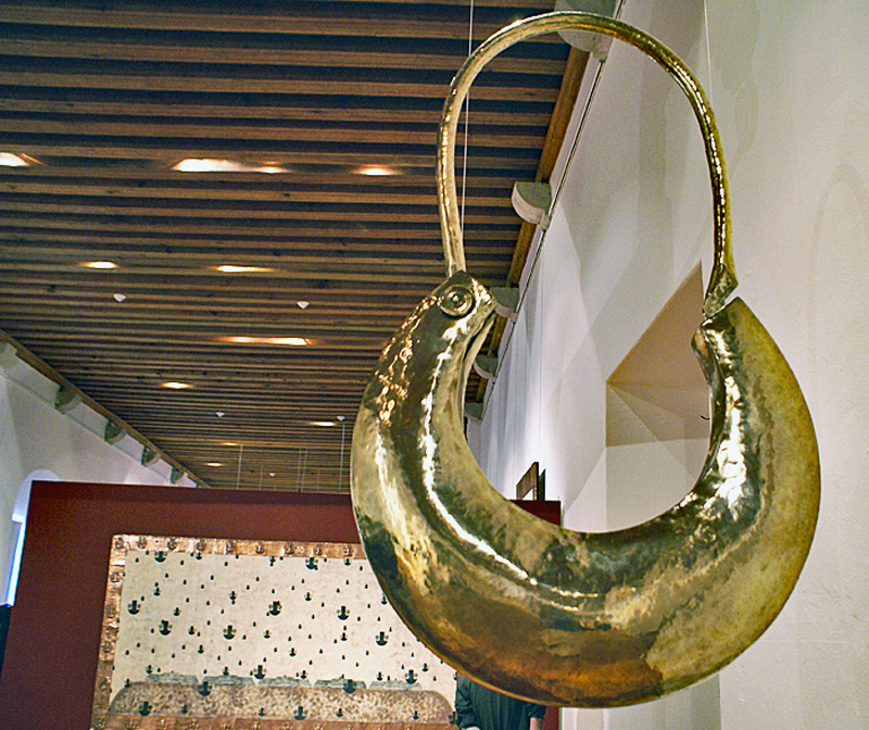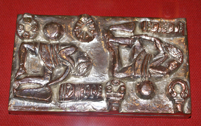 After we finished breakfast in Xalapa, we went to the Xalapa Museo de Antropología primarily to see the display of colossal Olmec heads. The heads, carved of basalt and estimated to date between 1400 and 900 B.C.E.,  range in height from just under five feet to just over eleven feet and weigh between six and fifty tons apiece.  Seventeen–or possibly 18–heads are known to exist.  The color variation in the photo is due to the lighting of the displays.