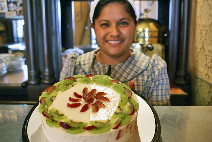 Lilia Facio Hernández offers us one of the 30+ gorgeous varieties of cakes made at the Museo del Dulce de la Calle Real (the Royal Road Candy Museum).  Buy as little as a slice to indulge yourself, or purchase as much as an entire cake for a party dessert.  Each cake is more beautiful than the next and each one has a name from Mexico's history.  This one is the Iturbide, named for General Agustín Iturbide, hero of Mexico's 1810 War of Independence and designer of Mexico's first flag.