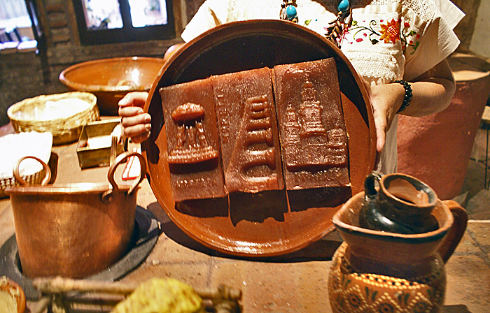 Dulces de la Calle Real (the candy maker's brand name) prepared specialty ates de membrillo in molds which were carved for the 200th anniversary of Mexico and which create the embossed images of some of Morelia's historic landmarks: (from left) Las Tarascas fountain, the 18th Century aqueduct, and the Cathedral.