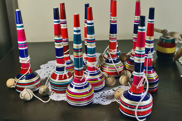 Another entire room of the store is just stuffed with a variety of small toys, perfect for an inexpensive souvenir from Morelia.  Inexpensive and easy to pack, they're exactly right for the child in all of us. These are baleros.  The idea is to hold the long handle in your fist (with the cup on top) and catch the small wooden ball.  It looks easy to accomplish–but it's quite a challenge!