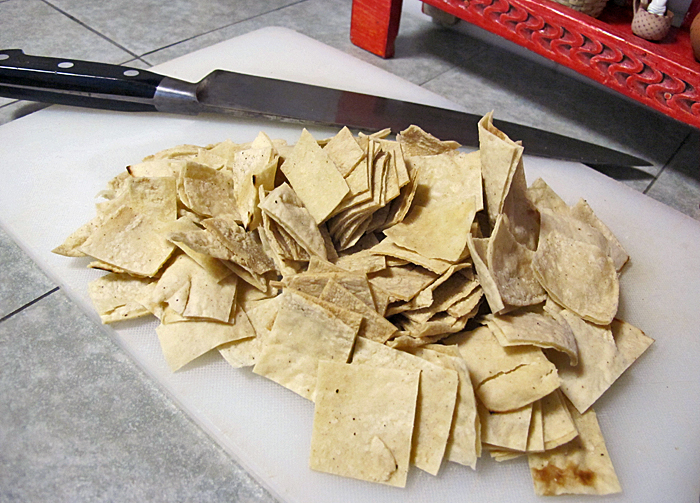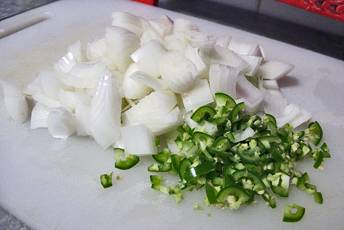 3. Cut the stem away from the chiles, take out the seeds and veins. Cut the chiles into smallish pieces, ready to be whizzed in the blender.