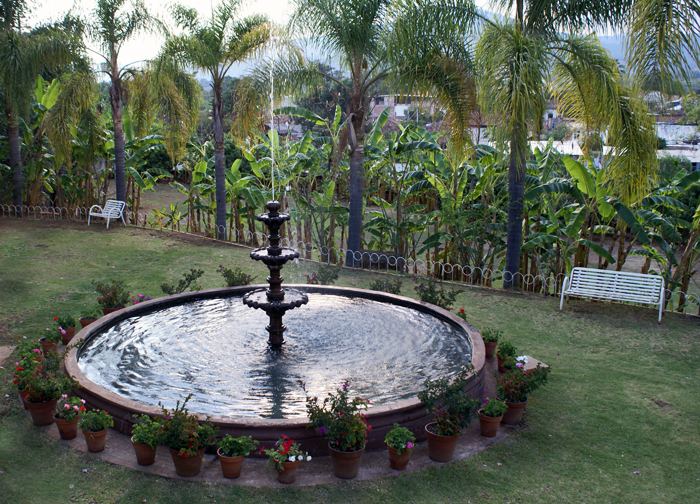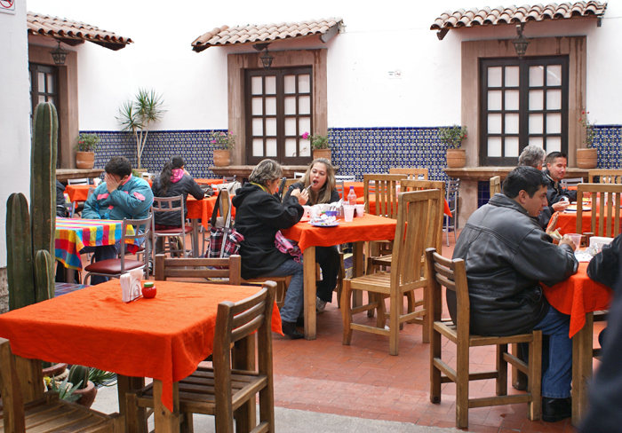 Looking around, I saw chickens picking and scratching all over the dirt floor of the central patio, the pila