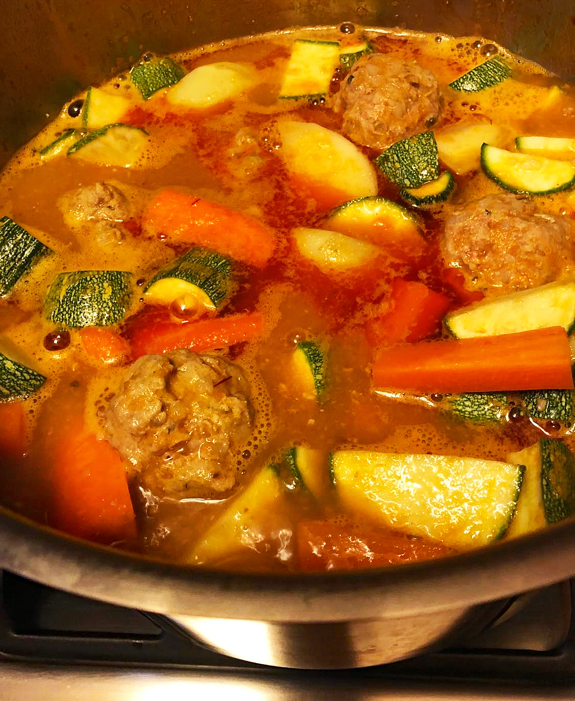 Pour the salsa into a 2-quart pot.  Add the meatballs and bring to a simmer.  Cover and allow to simmer for about 30 minutes.  Mexico Cooks! prepared six meatballs for our comida (main meal of the day), but two meatballs apiece were plenty for the two of us.  We ate the leftovers (and another two meatballs) the following day.  We froze twelve raw meatballs without salsa for subsequent meals.