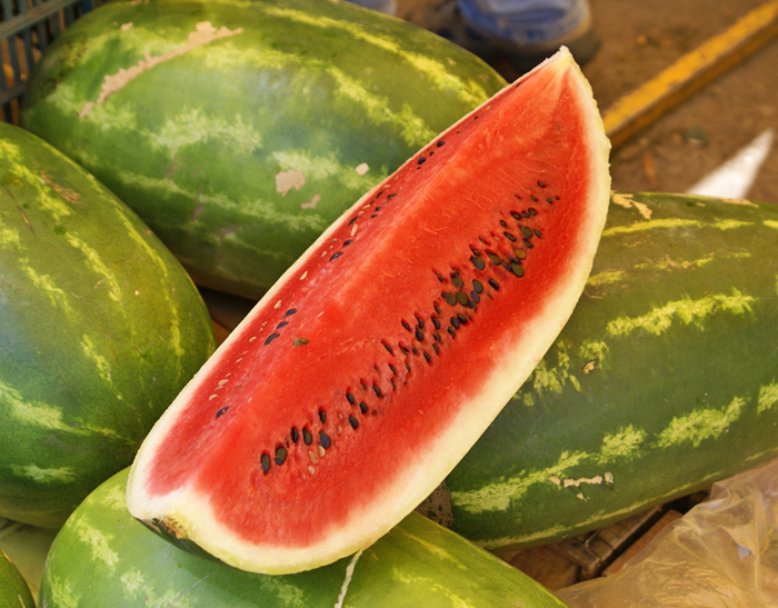 Last, the sandía (watermelon).  Available all over Mexico and in season right this minute, the sweetness of the fruit is as refreshing as a cool shower.  Native to somewhere in Africa–there's lots of controversy about where–and over 5000 years old, Mexico's watermelon is grown primarily in this country's western and eastern coastal states.