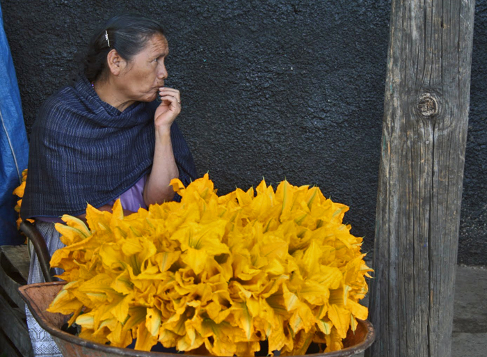 Purhépecha woman selling flor de calabaza (squash flowers) from a wheelbarrow in Paracho, Michoacán.