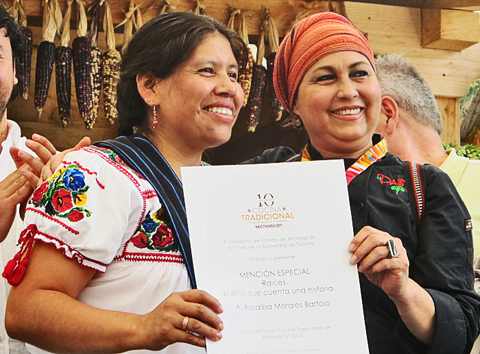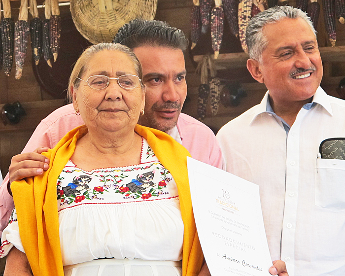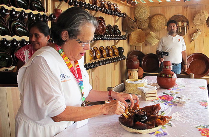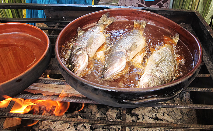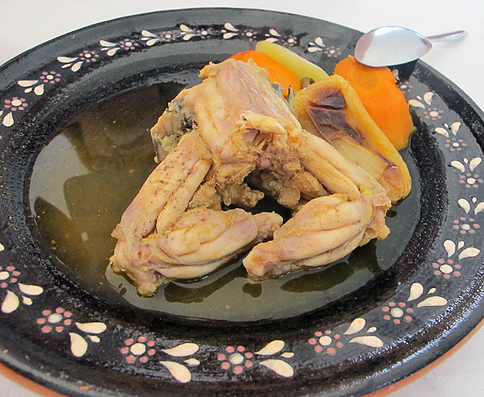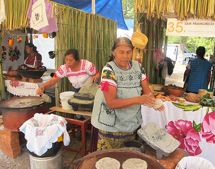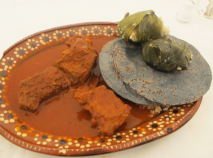 One of my personal favorite Oaxaca restaurants is the Istmo de Tehuantepec's La Teca, owned by the marvelous Sra. Deyanira Aquino. As part of another day's many-course main meal, friends and I shared these four molotes de plátano macho (small, sweetly ripe plantain croquettes) topped with crema de mesa (table cream) and queso fresco (fresh cheese), dividing the last one into smaller and smaller pieces so that one of us did not hog the whole thing–although each of us would have!