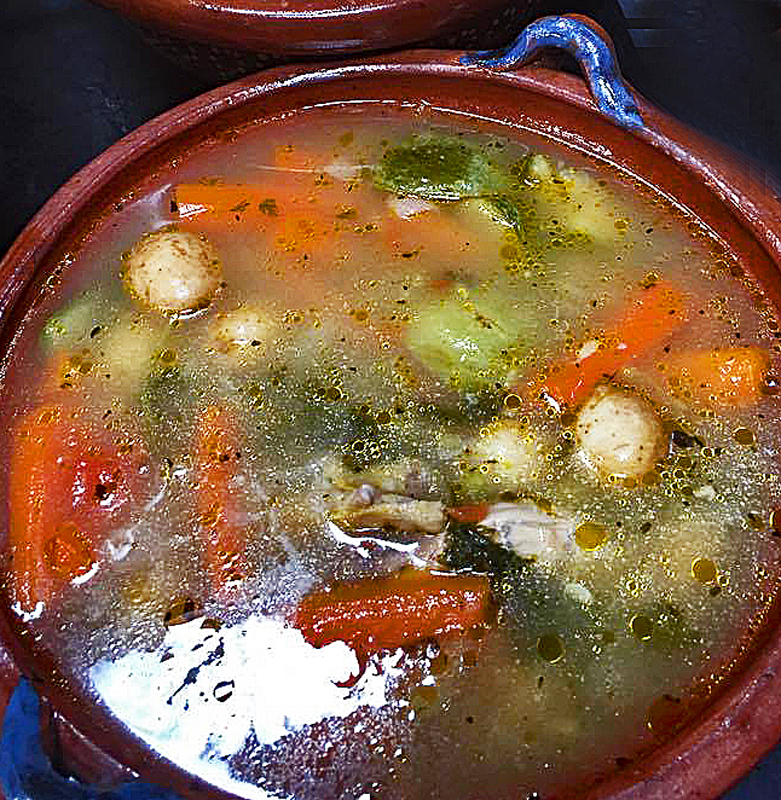Pozole blanco (white pozole) with delicious clear broth that starts with a a long-simmered whole pig's head, nixtamalized native white cacahuatzintle corn, and lots of tender, flavorful pork meat. Add to the pot some herbs and spices. Then add hunks of avocado at the table–along with a squeeze or two of limón criollo (you know it as Key lime), some crushed, dried Mexican oregano, crushed, dried chile de árbol, a raw egg fresh from the shell (it cooks in the hot broth), and, if you like, a tablespoon or two of mezcal. Traditional and heavenly!
