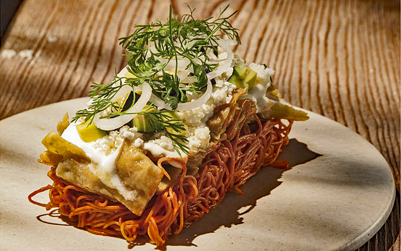 Chef Silvana holds a memela. A small, freshly toasted tortilla is the base for a smear of asiento, a smear of creamy black beans, maybe some tasajo or cecina, a lot of queso fresco (fresh crumbly white cheese), some sliced avocado, and then topped with either red or green salsa. These Oaxaca-style memelas are usually about four inches in diameter.