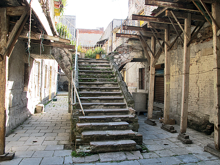 Interior of a seriously deteriorated vecindad (essentially, a tenement house) on Calle República de Uruguay. Restoration work is underway, as you can see from the heavily braced walls.