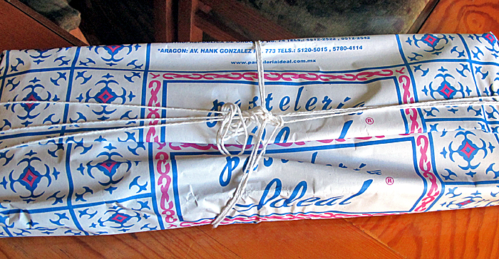 Package tied up with string from the famous Pastelería La Ideal, which has a branch located at República de Uruguay #74. It's almost guaranteed that as you stroll along this street, especially in the early morning or in the evening, you will see hordes of people carrying boxes and packages with this design. Everyone wants pan dulce (sweet bread) from La Ideal! The extraordinary pan from the bakery is (pardon me) ideal for breakfast or supper. Pastelería La Ideal, with its three branches, is arguably the most famous bakery in Mexico City.