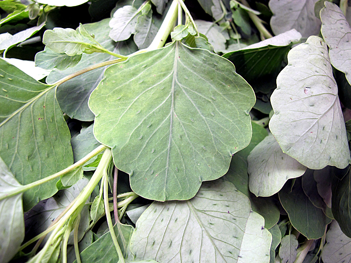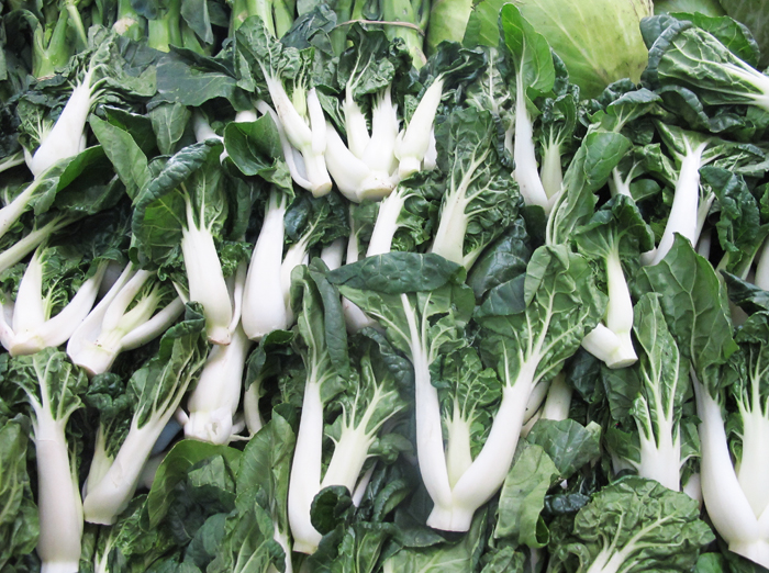 Baby bok choy at the Mercado San Juan.  Each of these little bok choys is about six inches long, perfect for steaming.  Most of the most-used fresh Asian vegetables (long beans, bitter melon, snow peas, bok choy of two or three kinds, and more) are regularly available at this downtown Mexico City market.